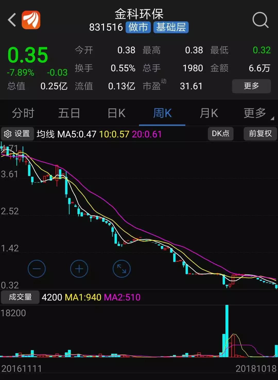 自2016年以來(lái),金科環(huán)保股價(jià)一直持續(xù)走低。2016年12月30日,金科環(huán)保收盤價(jià)為4.23元/股,至今跌幅超過(guò)90%。10月18日金科環(huán)保收盤價(jià)為0.35元/股,跌幅為7.89%,成交6.63萬(wàn)元。