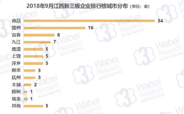 截止到2018年9月30日,新三板共有10946家掛牌公司,江西有150家新三板企業(yè),占比1.3%;其中95家企業(yè)有市值,占比63.3%。