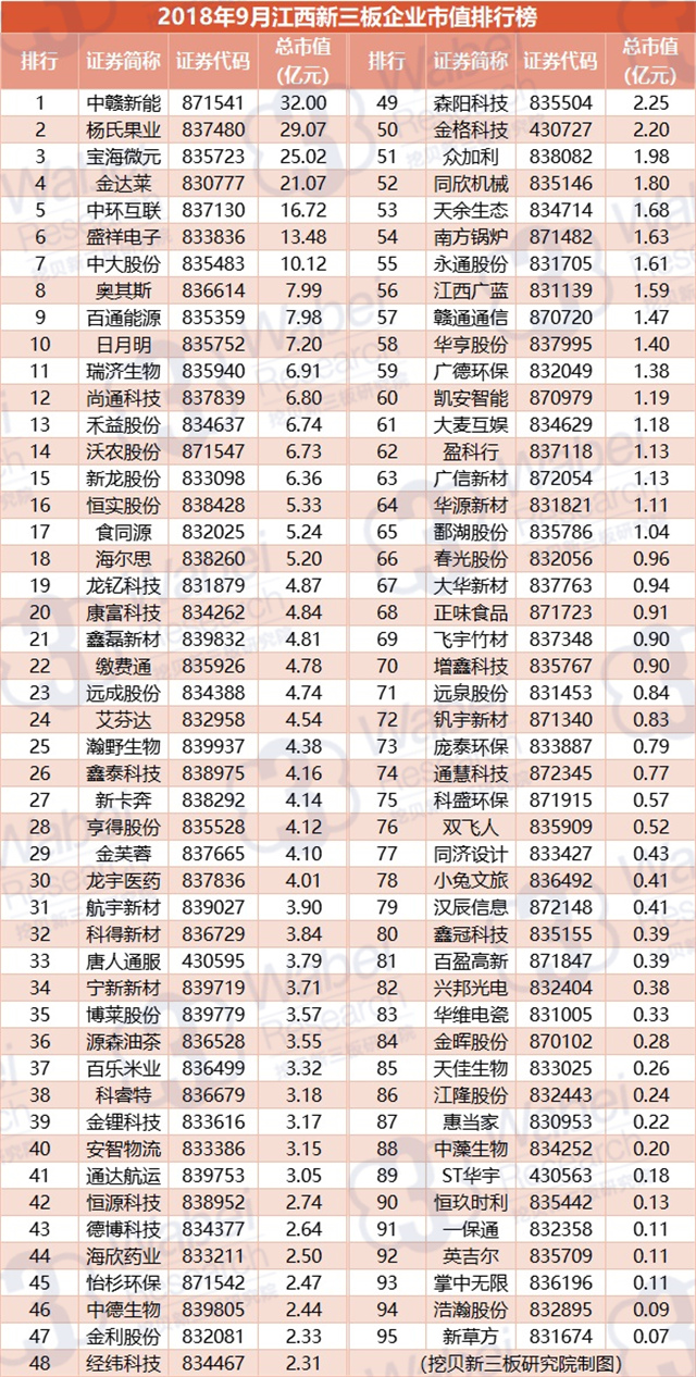 附:2018年9月江西新三板企業(yè)市值排行榜