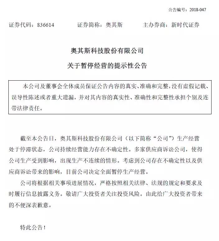 10月18日,奧其斯發(fā)出公告,決定全面暫停生產(chǎn)經(jīng)營(yíng)。