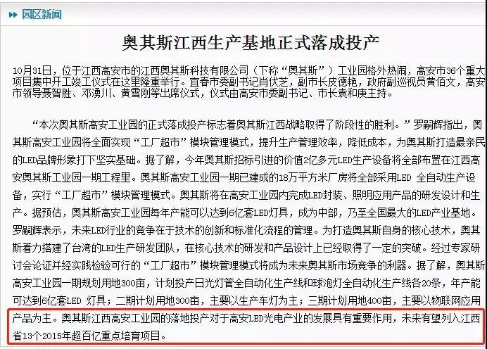 高安地方領(lǐng)導(dǎo)在儀式上表示,奧其斯江西高安工業(yè)園的落地投產(chǎn),對(duì)于高安LED光電產(chǎn)業(yè)的發(fā)展具有重要作用,未來(lái)有望列入江西省13個(gè)2015年超百億重點(diǎn)培育項(xiàng)目。