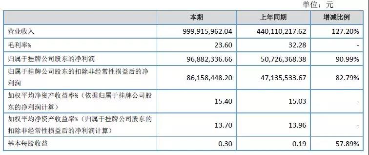 公開(kāi)轉(zhuǎn)讓說(shuō)明書(shū)顯示,公司2014年6月才正式投產(chǎn)。2015年,公司營(yíng)業(yè)收入就達(dá)到了4.4億元,凈利潤(rùn)5073萬(wàn)元;2016年公司營(yíng)業(yè)收入達(dá)到約10億元,凈利潤(rùn)9688萬(wàn)元。