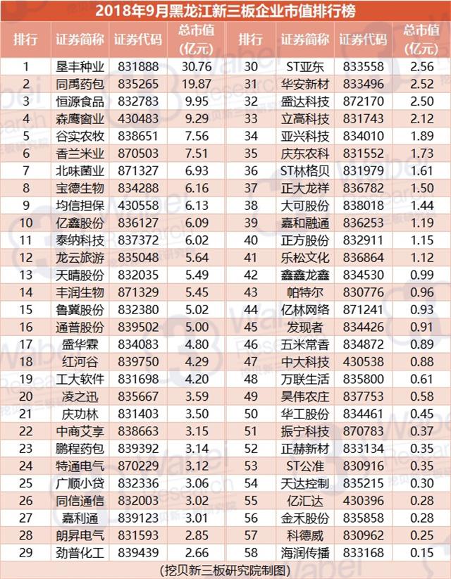 附:2018年9月黑龍江新三板企業(yè)市值排行榜