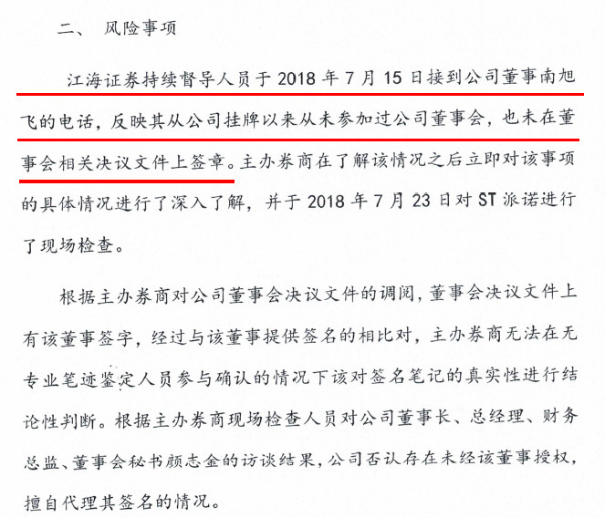 7月23日,主辦券商對(duì)ST派諾進(jìn)行現(xiàn)場(chǎng)檢查,調(diào)閱公司董事會(huì)決議文件后發(fā)現(xiàn),文件上有董事南旭飛的簽字,而顏志金否認(rèn)存在未經(jīng)該董事授權(quán)擅自代其簽名的情況。