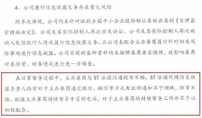 除了不給錢,ST派諾對(duì)于主辦券商的持續(xù)督導(dǎo)工作配合也不積極,短信、微信不理不睬,還經(jīng)常拒接主辦券商的電話……