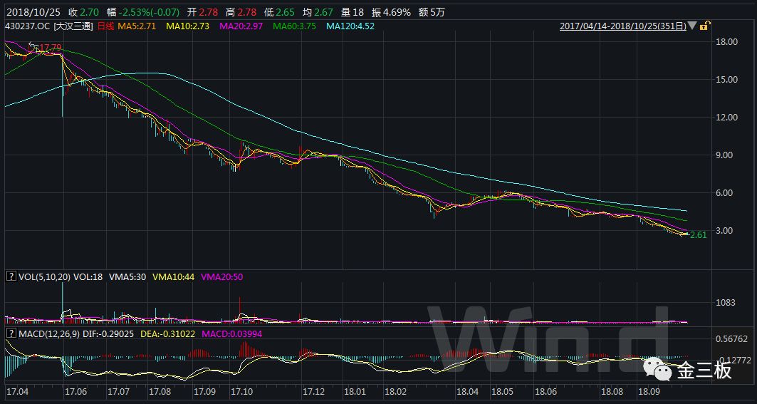 通信行業(yè)的新三板白馬股,大漢三通(430237.OC)近期走勢(shì)不佳,10月以來(lái)股價(jià)跌去17%,若往前追溯,該股已經(jīng)連續(xù)六個(gè)月股價(jià)下跌,2017年3月高點(diǎn)以來(lái),已下跌近九成。