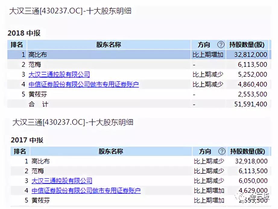 同時(shí),三胖哥發(fā)現(xiàn),由高比布及其妻子黃筱芬控制的公司第三大股東,大漢三通控股有限公司,自2017年以來(lái),累計(jì)減持股份數(shù)量是驚人的90.5萬(wàn)股,預(yù)估套現(xiàn)金額接近1000萬(wàn)!