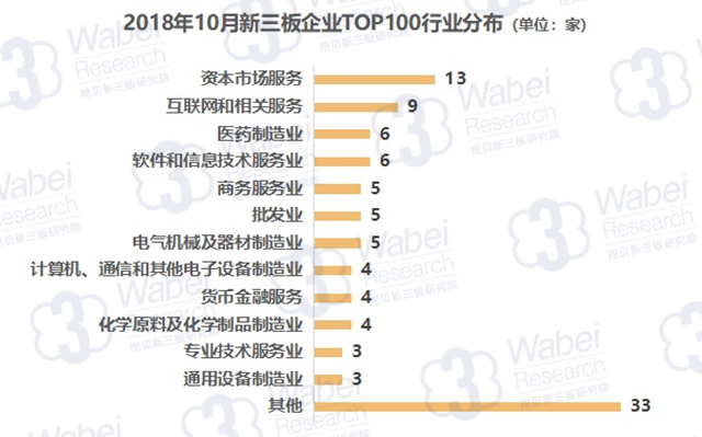 從行業(yè)分布來看,資本市場(chǎng)服務(wù)行業(yè)企業(yè)數(shù)量最多,有13家企業(yè);其次是互聯(lián)網(wǎng)和相關(guān)服務(wù),有9家企業(yè);醫(yī)藥制造業(yè)、軟件和信息技術(shù)服務(wù)業(yè)排名第三,均有6家企業(yè)。(來源:挖貝新三板研究院)