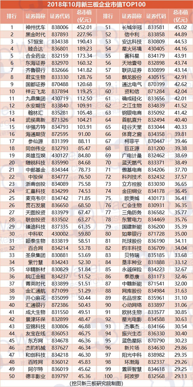 附:2018年10月全國(guó)新三板企業(yè)市值TOP100