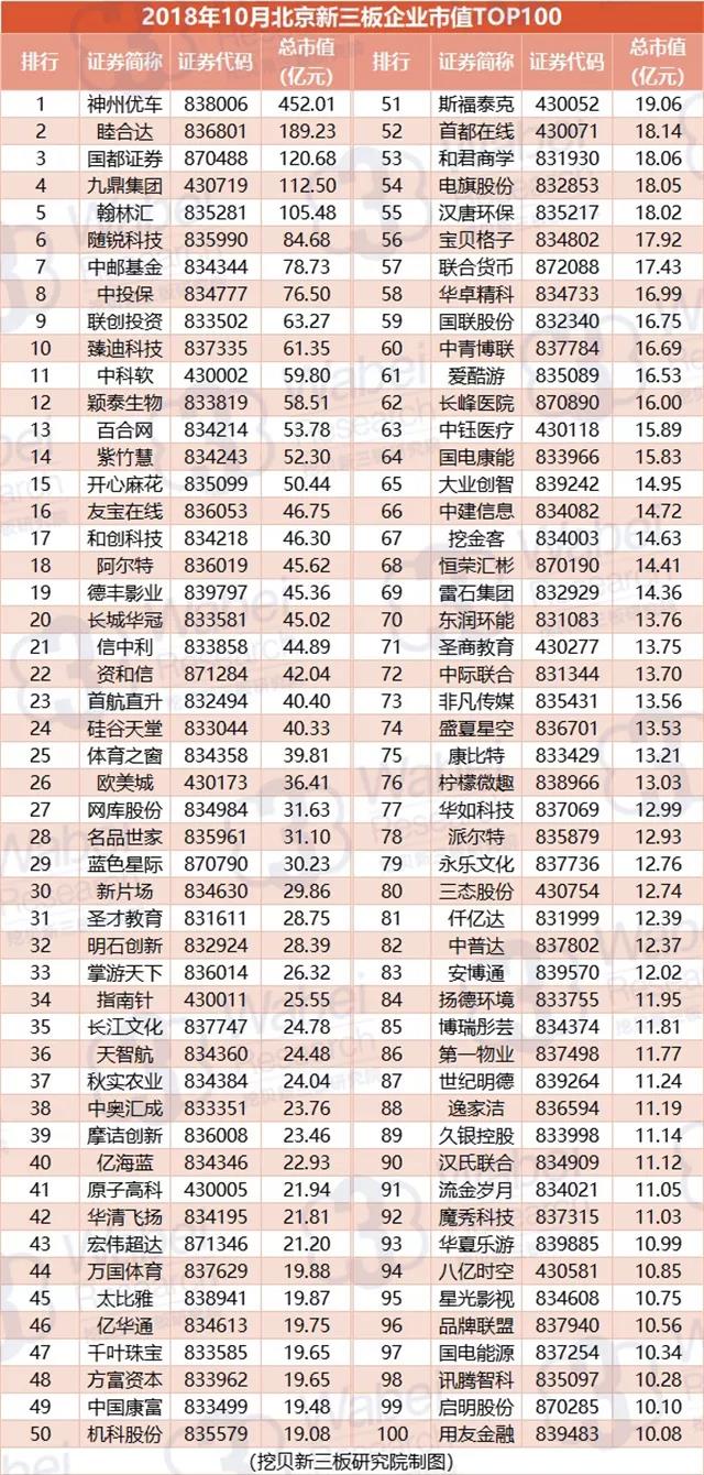 附:2018年10月北京新三板企業(yè)市值TOP100