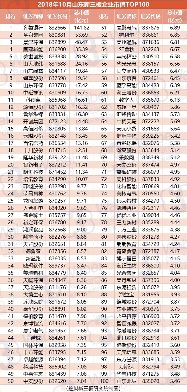 附:2018年10月山東新三板企業(yè)市值TOP100