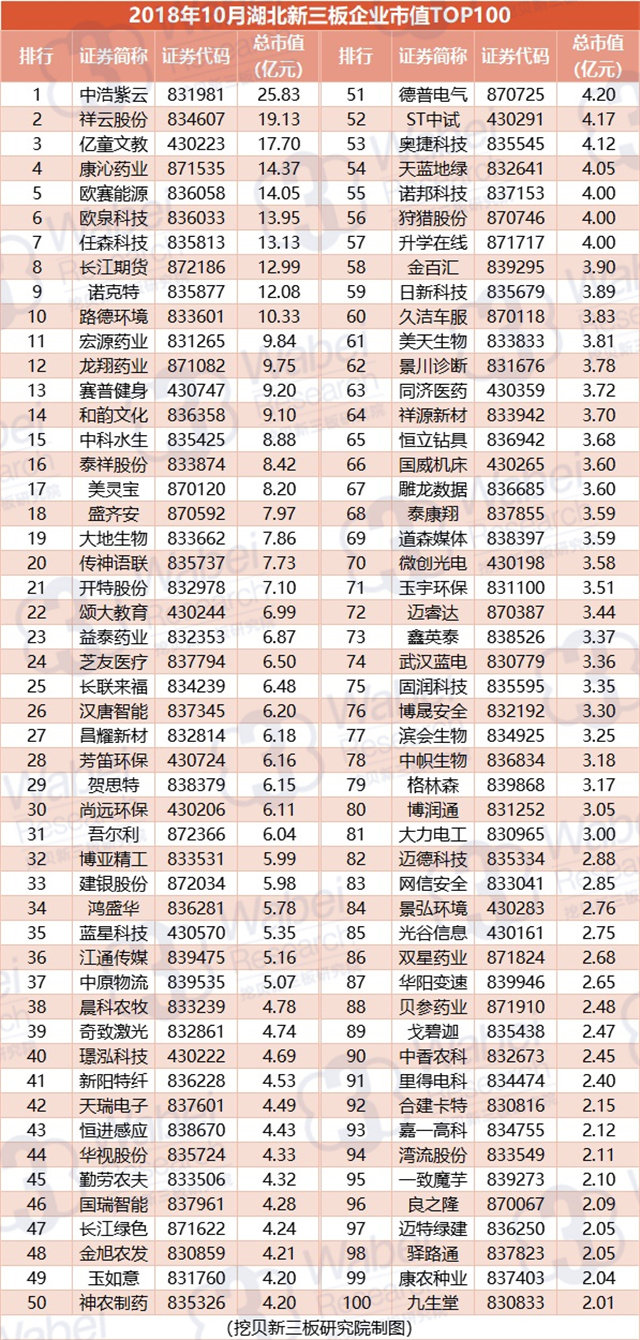 附:2018年10月湖北新三板企業(yè)市值TOP100