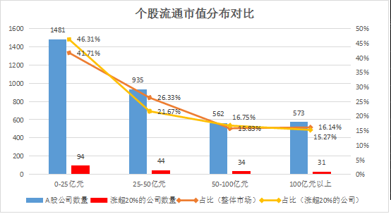 再看看近20個(gè)交易日漲幅超20%的個(gè)股情況,可以發(fā)現(xiàn),總共有203家公司股價(jià)近20個(gè)交易日漲幅超20%,其中流通市值不足25億元的占比最高,達(dá)到46.31%;而流通市值不足50億元的占比68%。值得注意的是,流通市值不足25億元的公司在市場上占比41.71%,而近20個(gè)交易日以來,漲幅超20%的個(gè)股里,流通市值不足25億元的公司占比明顯高于市場整體比例。