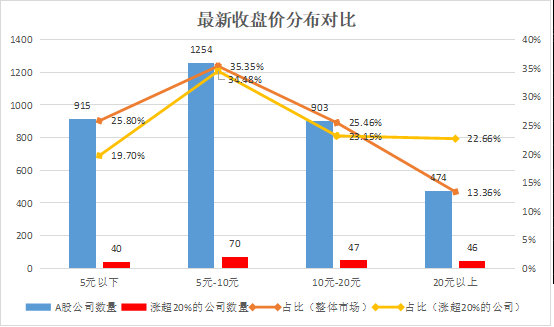 而在近20個(gè)交易日股價(jià)漲幅超20%的203家公司中,其中股價(jià)不足5億元的占比為19.7%;不足10元的占比54.19%。而這一比例還低于市場整體比例。表明,近期超跌低價(jià)股雖然漲勢“喜人”,但是市場上超跌的太多了,很多低價(jià)股并未啟動(dòng)。