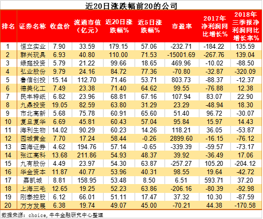 金證互通旗下的牛牛金融研究中心統(tǒng)計(jì)發(fā)現(xiàn),自指數(shù)探底以來,近20個(gè)交易日共有19家公司股價(jià)漲幅超50%,其中恒立實(shí)業(yè)與群興玩具實(shí)現(xiàn)翻倍。這20家公司多數(shù)在本周漲幅巨大。仔細(xì)分析發(fā)現(xiàn),近20個(gè)交易日漲幅前20的公司,11家公司市盈率高于30倍,7家是負(fù)的市盈率;2017年僅9家公司實(shí)現(xiàn)凈利潤同比正增長,2018年3季報(bào)則僅8家盈利增長。也就是說,這些公司要么就是高估值,要么就是業(yè)績差。