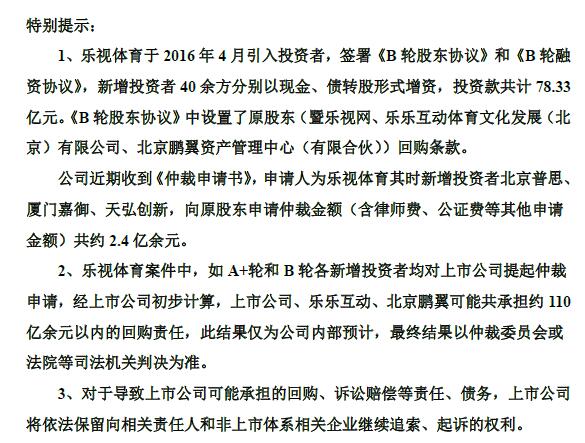 據(jù)樂(lè)視網(wǎng)評(píng)估,樂(lè)視體育案件中,如A+輪和B輪各新增投資者均對(duì)上市公司提起仲裁申請(qǐng),樂(lè)視網(wǎng)、樂(lè)樂(lè)互動(dòng)、北京鵬翼可能共承擔(dān)約110億余元以內(nèi)的回購(gòu)責(zé)任。