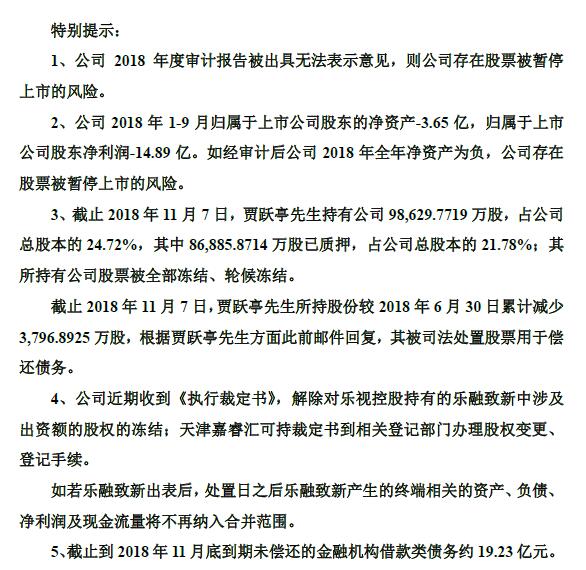2018 年11 月7 日,賈躍亭先生持有公司98,629.7719 萬(wàn)股,占公司總股本的24.72%,其中86,885.8714 萬(wàn)股已質(zhì)押,占公司總股本的21.78%;其所持有公司股票被全部?jī)鼋Y(jié)、輪候凍結(jié)。