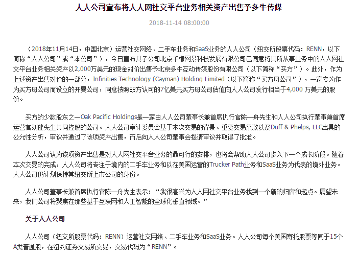 11月14日早上8點,運營社交網(wǎng)絡、二手車業(yè)務和SaaS業(yè)務的人人公司,通過人人網(wǎng)公布了一則消息。