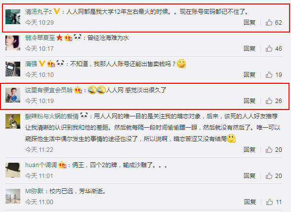 有網(wǎng)友表示,自己曾經(jīng)通過人人網(wǎng)認識了不少校友,至今雖然不再上人人網(wǎng),但與校友還有聯(lián)系;也有網(wǎng)友表示,自己甚至連賬號也不記得,但依然懷念以前干凈的界面以及獨有的方形臉表情包。